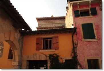 - Osservazioni: Alla estremità nord della cortina edificata, subito allesterno dellarco dingresso alla corte, si conserva laltra torre colombara, preceduta da un basso volume a due piani, oggi tinteggiato di colore giallo ocra, con un vistoso portale architravato segnato da grosse bugne. Si conservano i caratteristici fori nella parte sommitale compresa tra la cornice marcapiano e la cornice di gronda, entrambe in pietra sorrette da mensoline e cornice a dentelli in mattoni, su cui poggia la copertura a piramide sigillata da ... Allinterno è visibile lantica muratura in sasso, le cornici in pietra di porte e finestre, nonché la copertura lignea con capriata centrale.