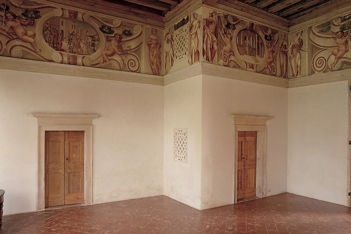 - Descrizione: All'interno, il salone centrale è decorato con un alto fregio sottotrave che corre lungo le quattro pareti: otto scene, forse tratte dalla "Storie della tragedia di Orazio" di Pietro Aretino, incorniciate da volute dipinte e figure di putti e cariatidi.