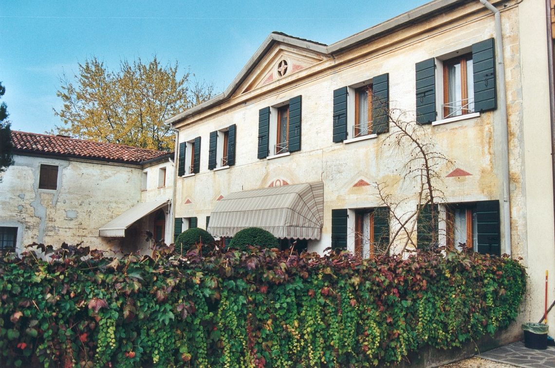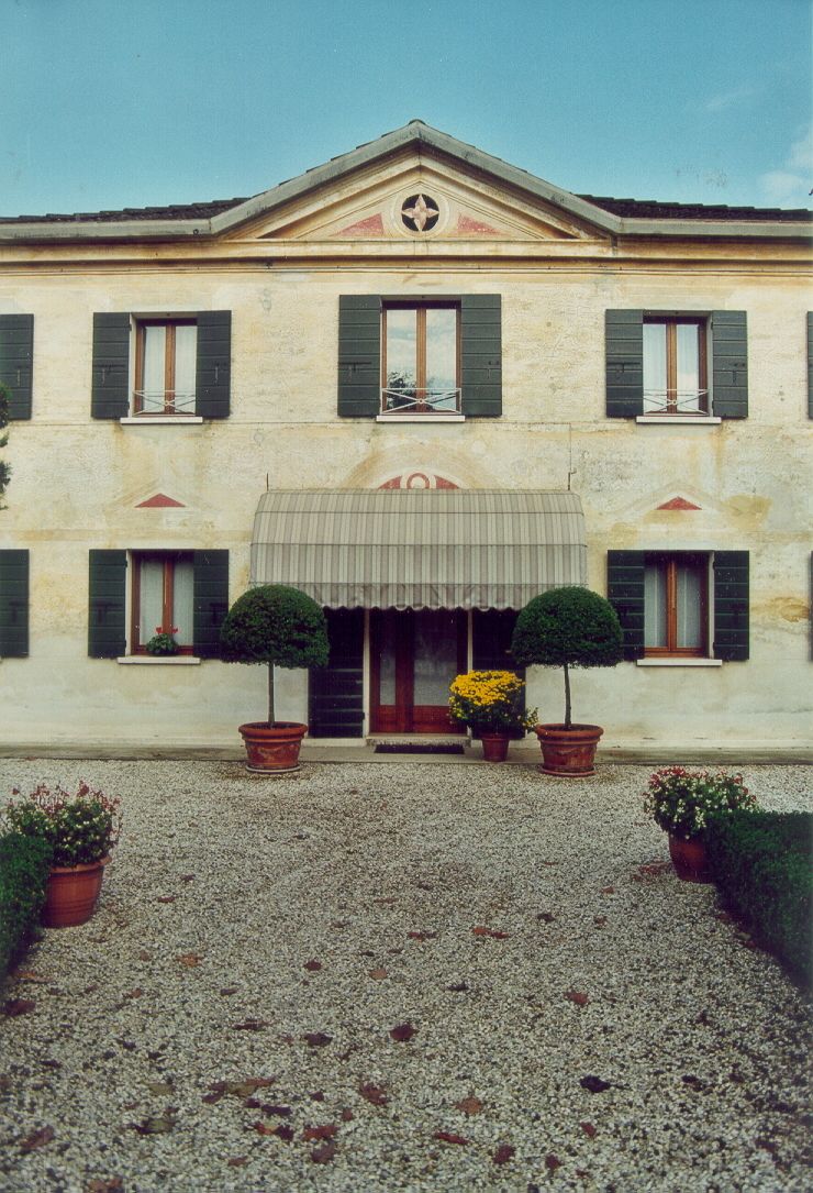 - Descrizione: Un frontoncino curvilineo affrescato sormonta il portone d'ingresso del corpo padronale: al centro presenta un motivo a cerchi concentrici; frontoncini triangolari sono affrescati sopra ogni apertura del pianterreno della casa: il loro colore rosso all'interno riprende il colore rosso del timpano centrale.