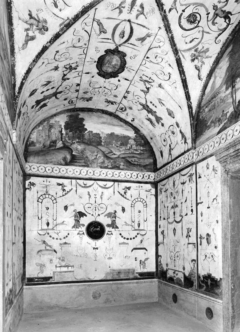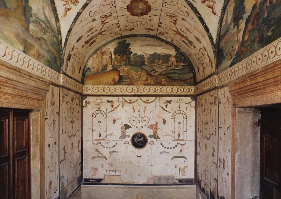- Descrizione: Camerino delle Grottesche. Grottesche e scene mitologiche, trionfi di imperatori romani; architetture dipinte. Tra le figure si riconoscono i membri della famiglia Pojana davanti alla figura della Pace.
