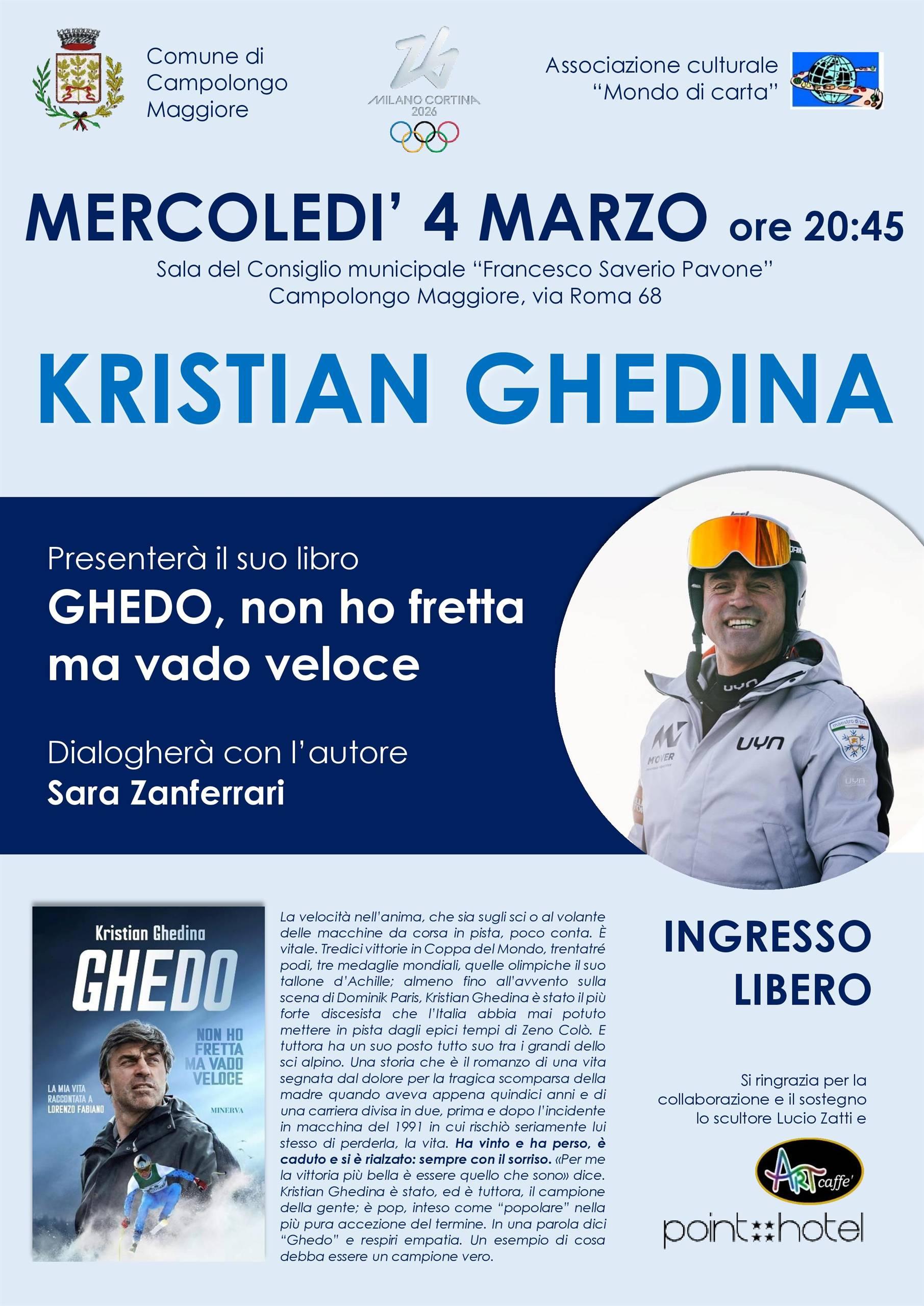 Mercoledì 4 marzo 2026 alle ore 20.45, presso la Sala del Consiglio Municipale “Francesco Saverio Pavone” a Campolongo Maggiore (via Roma 68), si terrà l’incontro con Kristian Ghedina, campione dello sci alpino e protagonista della storia sportiva italiana.