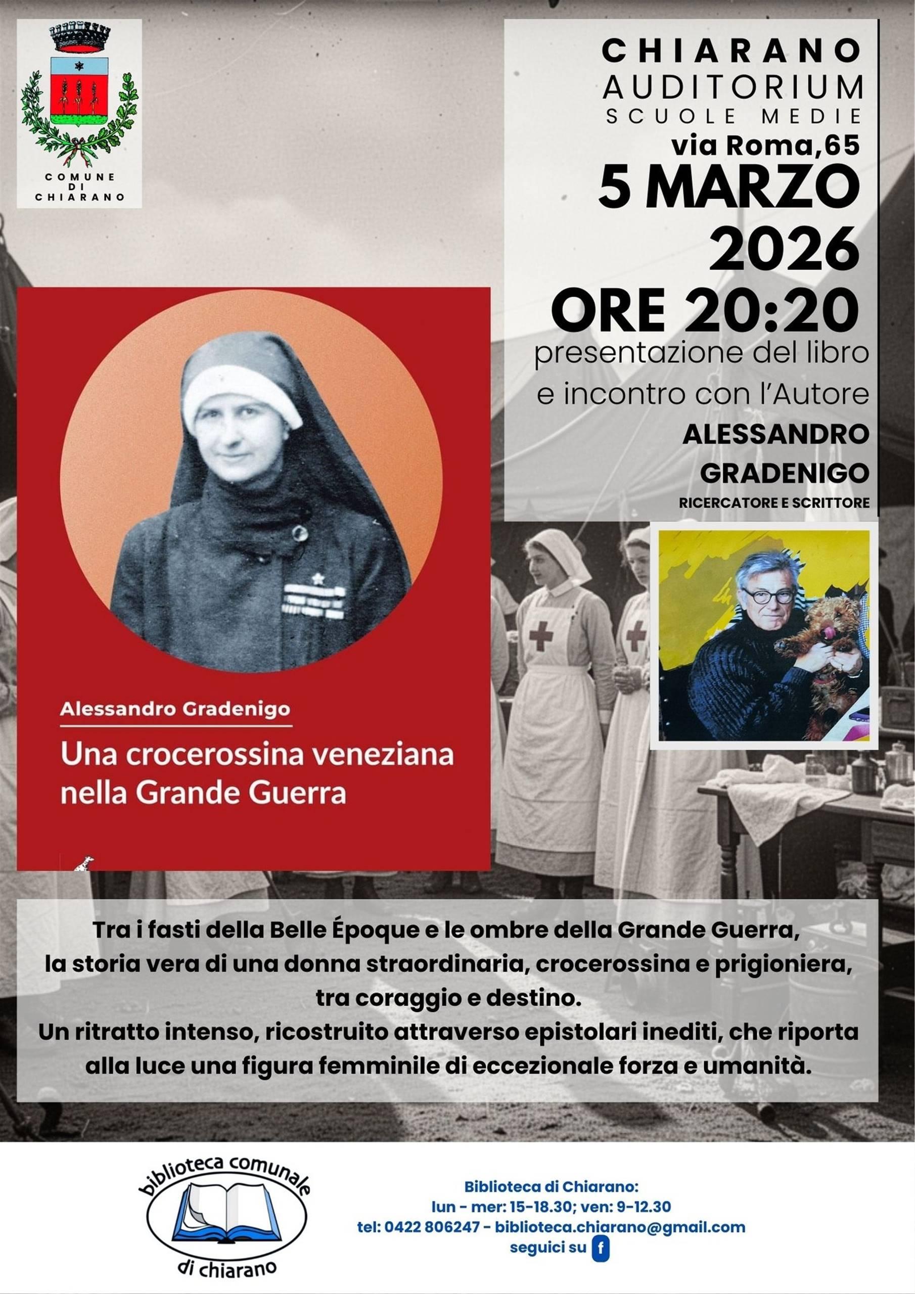 Giovedì 5 marzo alle ore 20:20 presso l' Auditorium delle scuole medie di Chiarano, si terrà un incontro con l'Autore Alessandro Gradenigo, per presentare il suo libro ''Una crocerossina veneziana nella Grande Guerra''.
