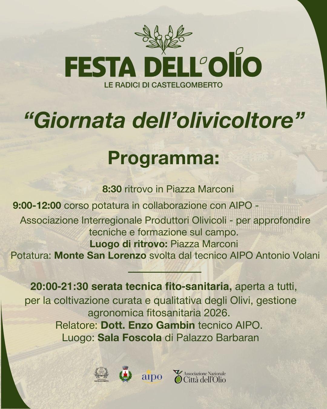 20:00-21:30 Sala Foscola di Palazzo Barbaran - Serata tecnica fito-sanitaria, aperta a tutti, per la coltivazione curata e qualitativa degli Olivi, gestione agronomica fitosanitaria 2026, con dott. Enzo Gambin tecnico AIPO.