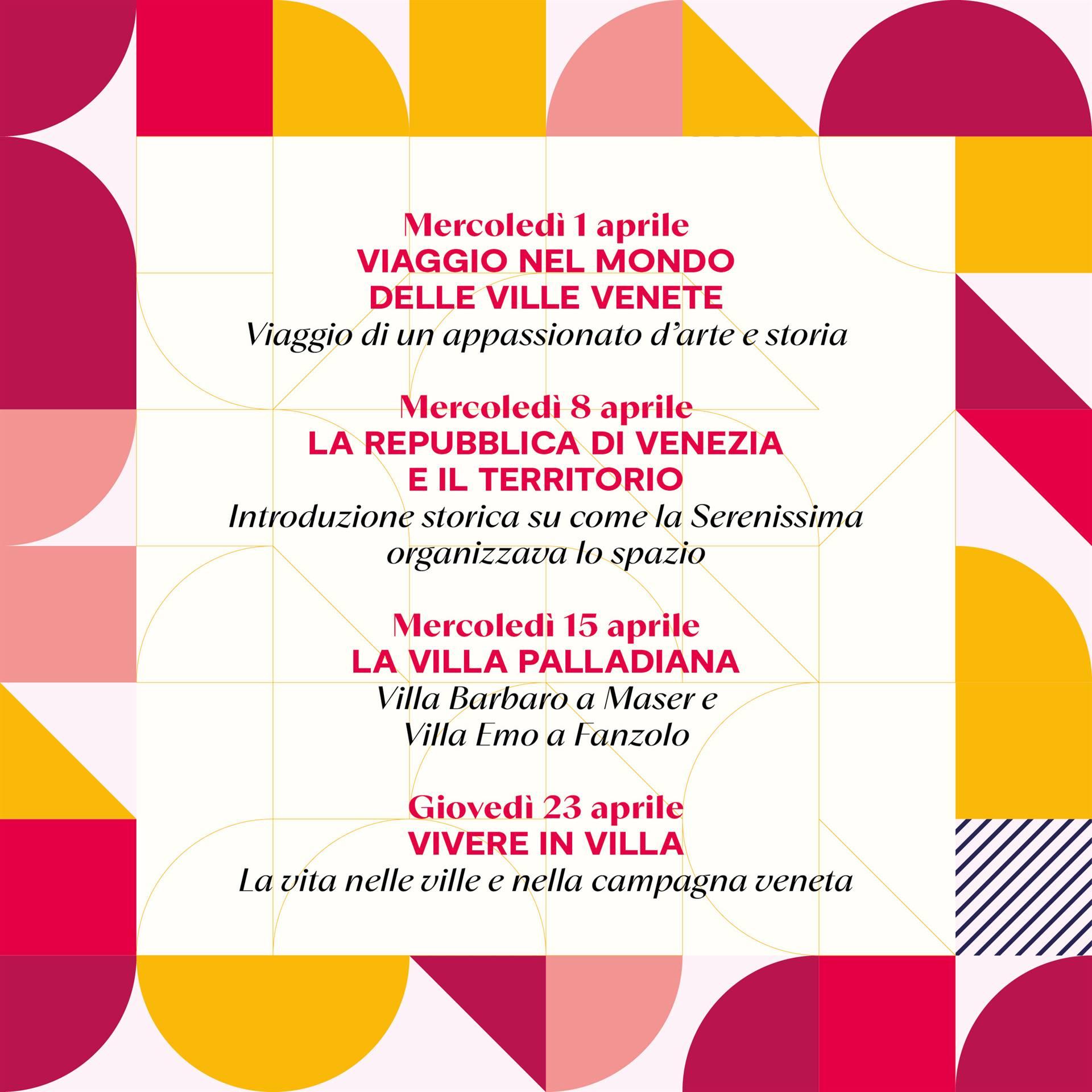 L’appuntamento previsto per mercoledì 15 aprile si focalizza specificamente sulla magnificenza della Villa Palladiana ponendo l'accento su due capolavori architettonici d'eccezione quali Villa Barbaro a Maser e Villa Emo a Fanzolo.
