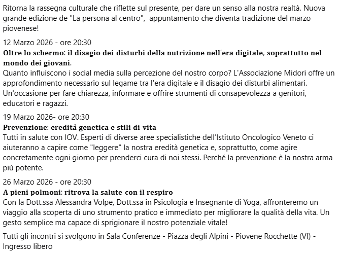 Giovedì 12-19-26 marzo alle 20:30 si terranno, presso la Sala Conferenze in Piazza degli Alpini a Piovene Rocchette, gli incontri dedicati La Persona al Centro, la 2^ edizione.