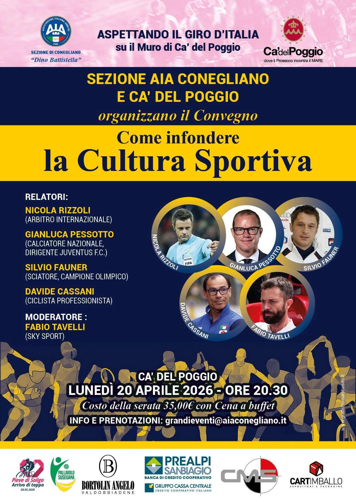Lunedì 20 aprile presso il ristorante di Ca' del Poggio, si terrà dalle 20.30 la conferenza "Come infondere la cultura sportiva". Sotto la moderazione di Fabio Tavelli (giornalista di Sky Sport), parleranno come relatori Nicola Rizzoli (arbitro internazionale), Gianluca Pessotto (calciatore nazionale e dirigente della Juventus), Silvio Fauner (sciatore e campione olimpico), Davide Cassani (ciclista professionista).