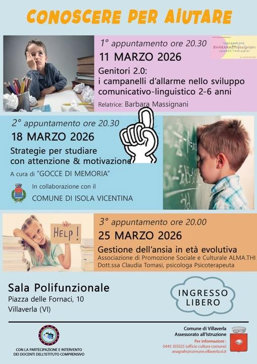 Mercoledì 11, 18 e 25 Marzo, si terrà, presso la Sala Polifunzionale a Villaverla, Conoscere per aiutare, organizzato da Comune di Villaverla - Assessorato all'Istruzione.