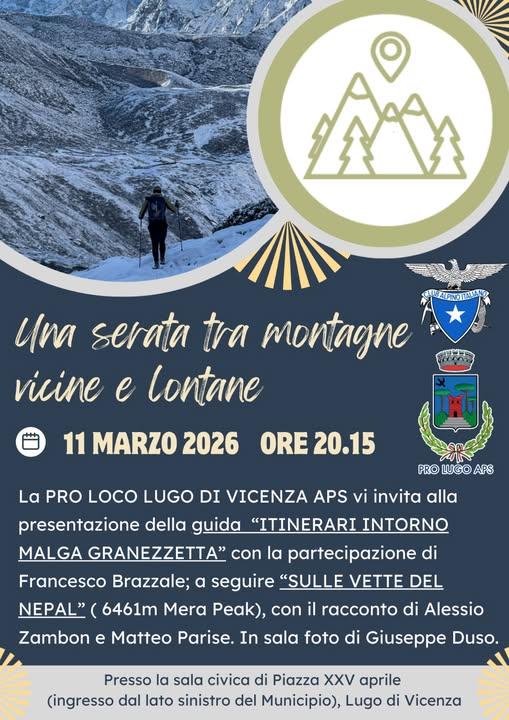La Pro Loco di Lugo di Vicenza organizza "Una serata tra montagne vicine e lontane" mercoledì 11 marzo alle 20:15 presso la Sala Civica di Piazza XXV Aprile, a Lugo di Vicenza.
