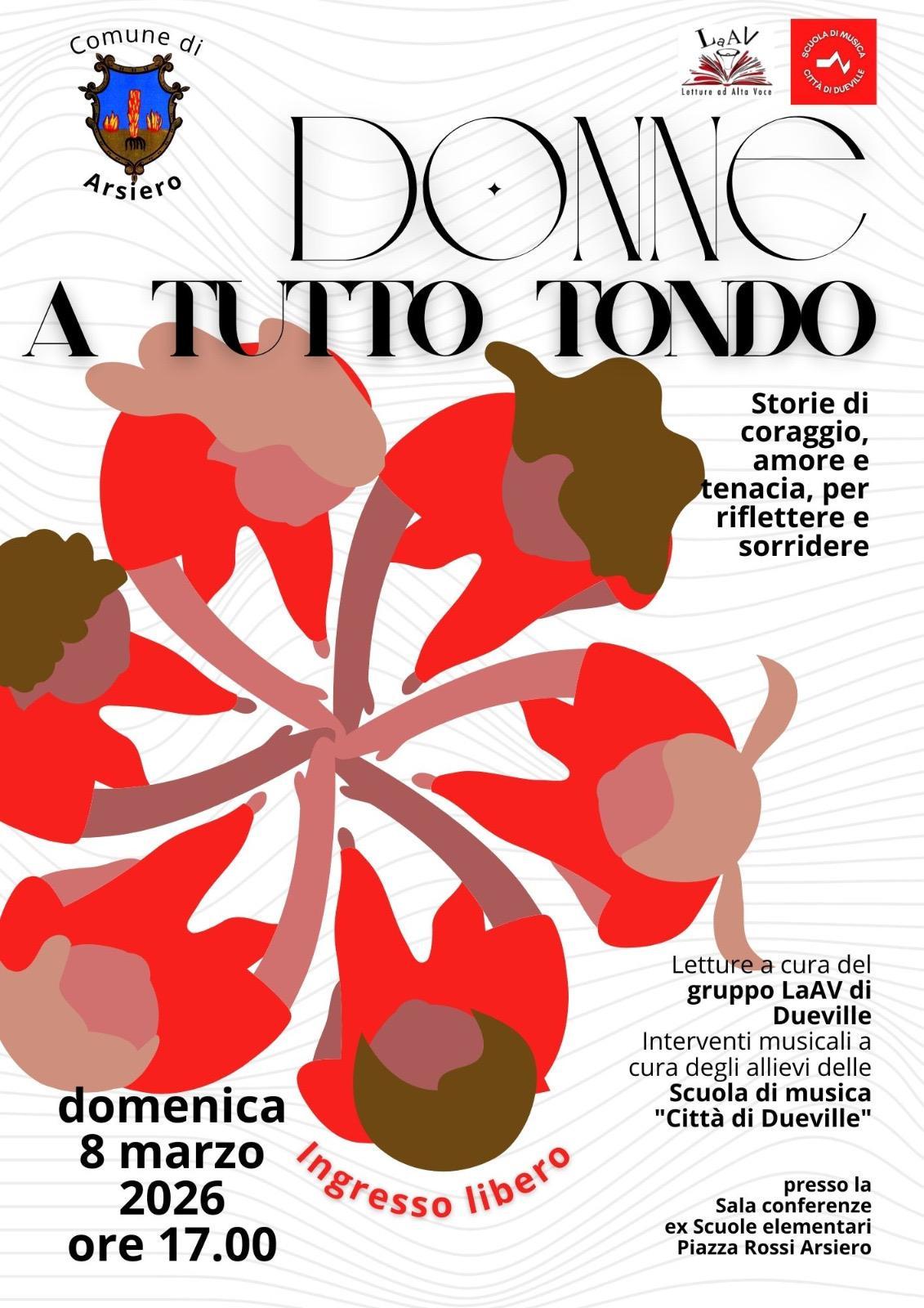 Il giorno domenica 8 marzo alle 17:00 si terrà "Donne a tutto tondo" presso la sala conferenze delle ex scuole elementari in Piazza Rossi ad Arsiero.