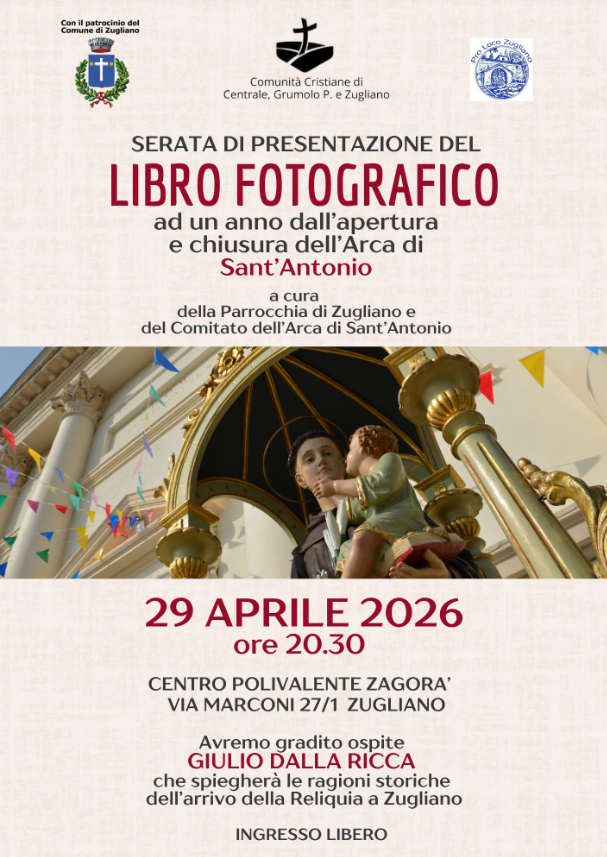 Mercoledì 29 Aprile, ore 20.30 presso Centro Polivalente Zagorà a Zugliano, si terrà la presentazione del Libro Fotografico ad un anno dall'apertura e chiusura dell' Arca di Sant'Antonio.
