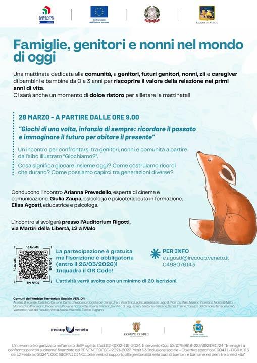 Sabato 28 marzo dalle 9:00 si terrà, presso l'Auditorium Rigotti di Malo, l'incontro Giochi di una volta, infanzia di sempre: ricordare il passato e immaginare il futuro per abitare il presente, un incontro per confrontarsi tra genitori, nonni e comunità a parire dall'albo illustrato "Giochiamo?". Ci sarà anche un dolce ristoro per allietare la mattina.