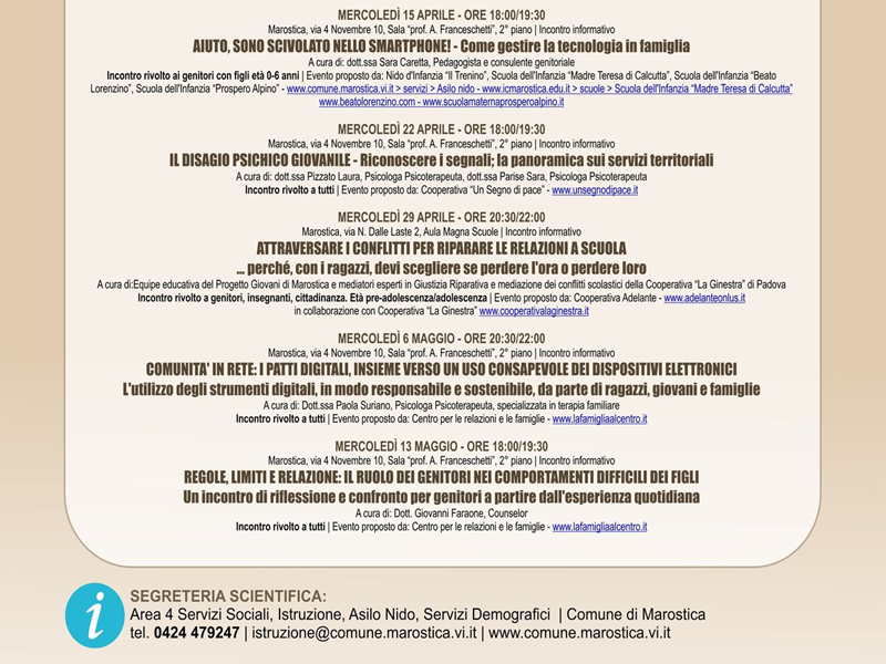- mercoledì 13 maggio: REGOLE, LIMITI E RELAZIONI: IL RUOLO DEI GENITORI NEI COMPORTAMENTI DIFFICILI DEI FIGLI - Un incontro di riflessione e confronto per genitori a partire dall'esperienza quotidiana