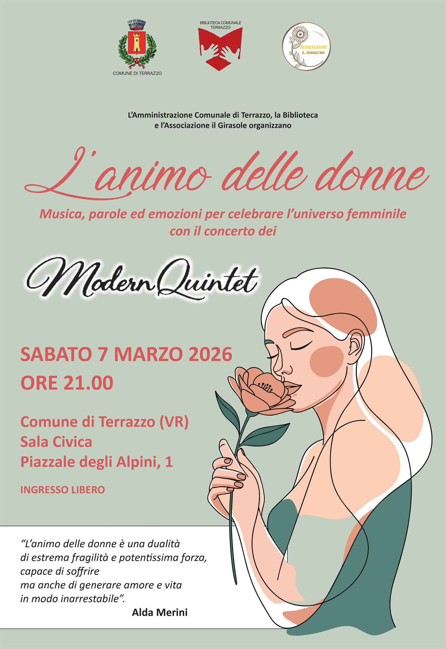 L'ANIMO DELLE DONNE musica, parole ed emozioni per celebrare l'universo femminile: con concerto dei Modern Quintet, si svolgerà sabato 7 marzo 2026 alle ore 21.00 presso la Sala Civica del Comune di Terrazzo (VR), in Piazzale degli Alpini 1.
