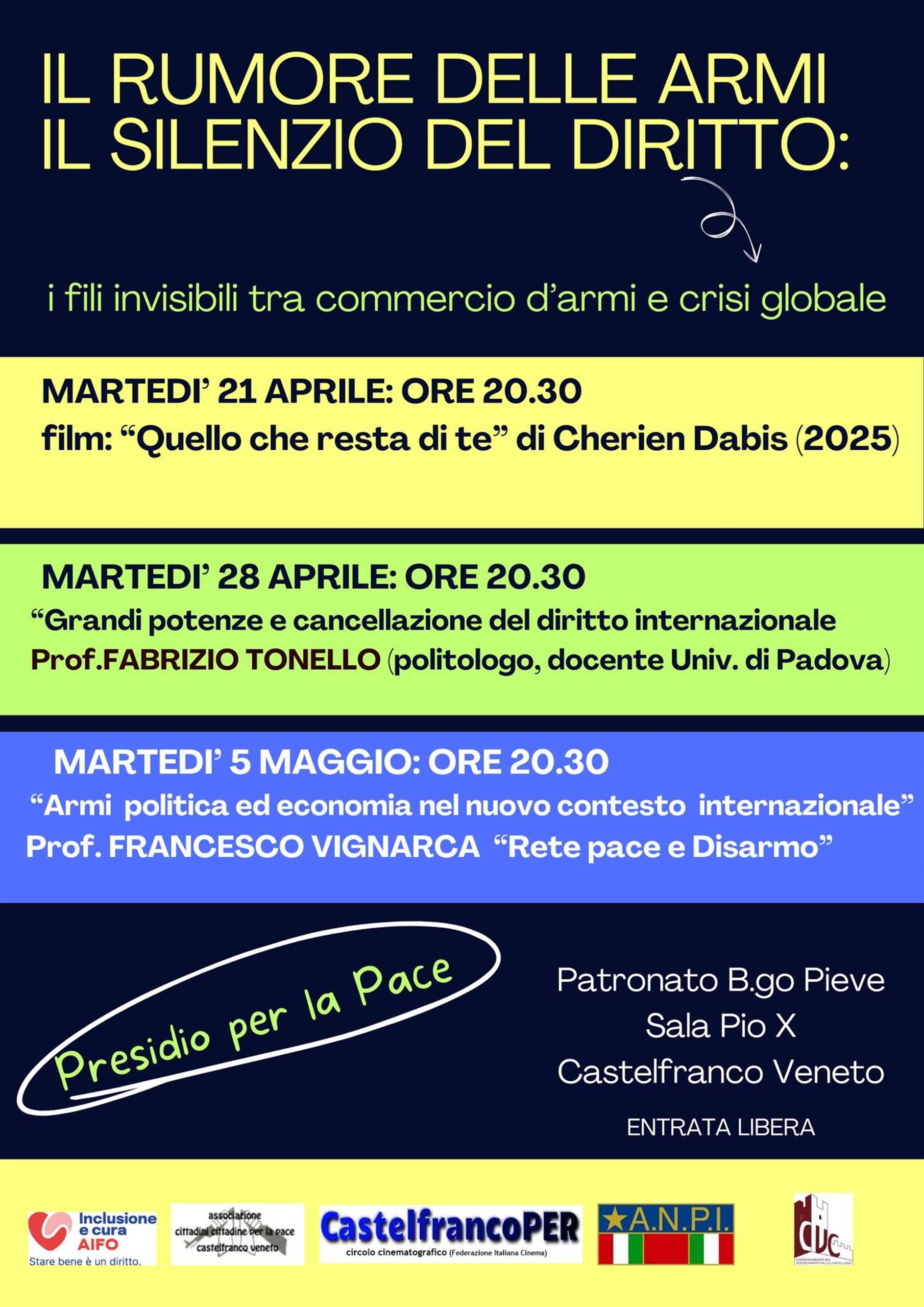Questa rassegna culturale, intitolata "Il rumore delle armi, il silenzio del diritto", si propone di indagare i legami profondi e spesso nascosti tra il commercio bellico e le attuali crisi che scuotono il panorama globale. Il ciclo di incontri si svolge presso la Sala Pio X del Patronato di Borgo Pieve a Castelfranco.