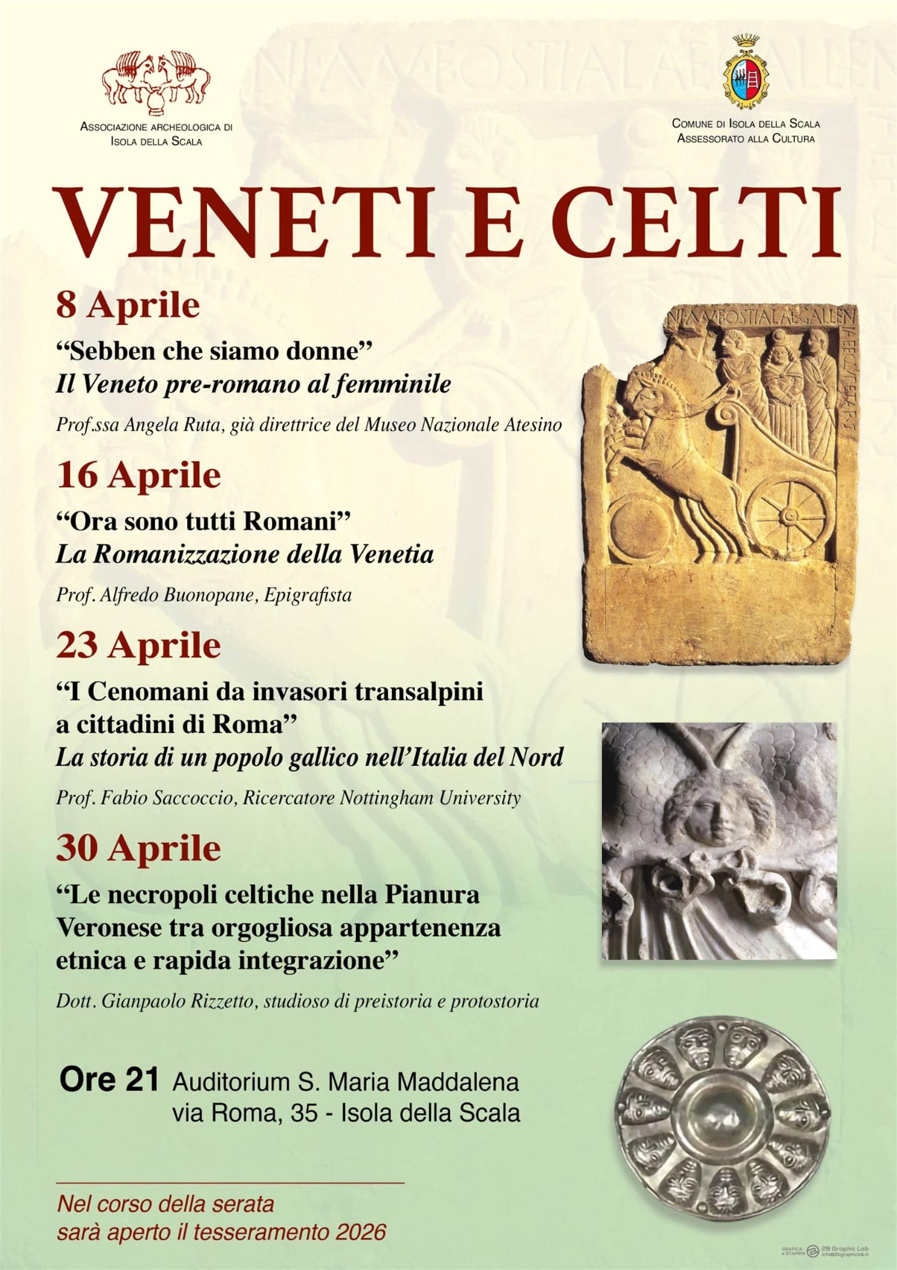 L’intervento del dott. Rizzetto previsto per il 30 aprile riguarderà invece, più nello specifico, le ricche necropoli celtiche scoperte nella pianura veronese, dove i segni dell’appartenenza etnica, come le armi (scudi, elmi e spade), lasciano