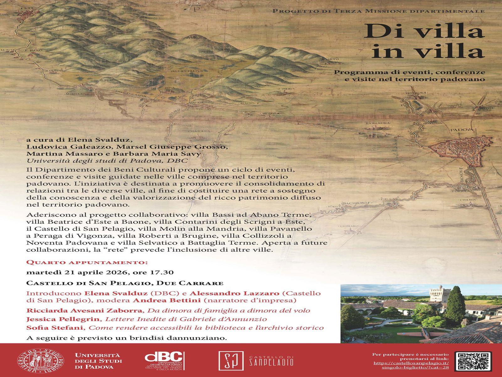 Introducono Elena Svalduz (DBC) e Alessandro Lazzaro (Castello di San Pelagio), modera Andrea Bettini (narratore d’impresa).Ricciarda Avesani Zaborra, Da dimora di famiglia a dimora del volo. Jessica Pellegrin, Lettere Inedite di Gabriele d’Annunzio. Sofia Stefani, Come rendere accessibili la biblioteca e l’archivio storico. A seguire è previsto un brindisi dannunziano. Prenotazione obbligatoria.