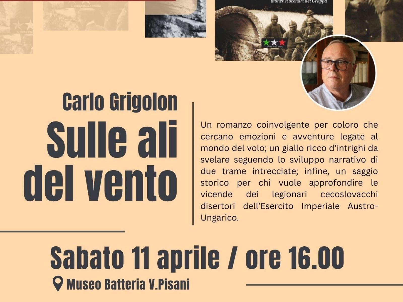Sabato 11 aprile alle ore 16.00 il Museo Batteria Vettor Pisani ospita la presentazione del libro "Sulle ali del vento. Un sussurro lontano" di Carlo Grigolon.