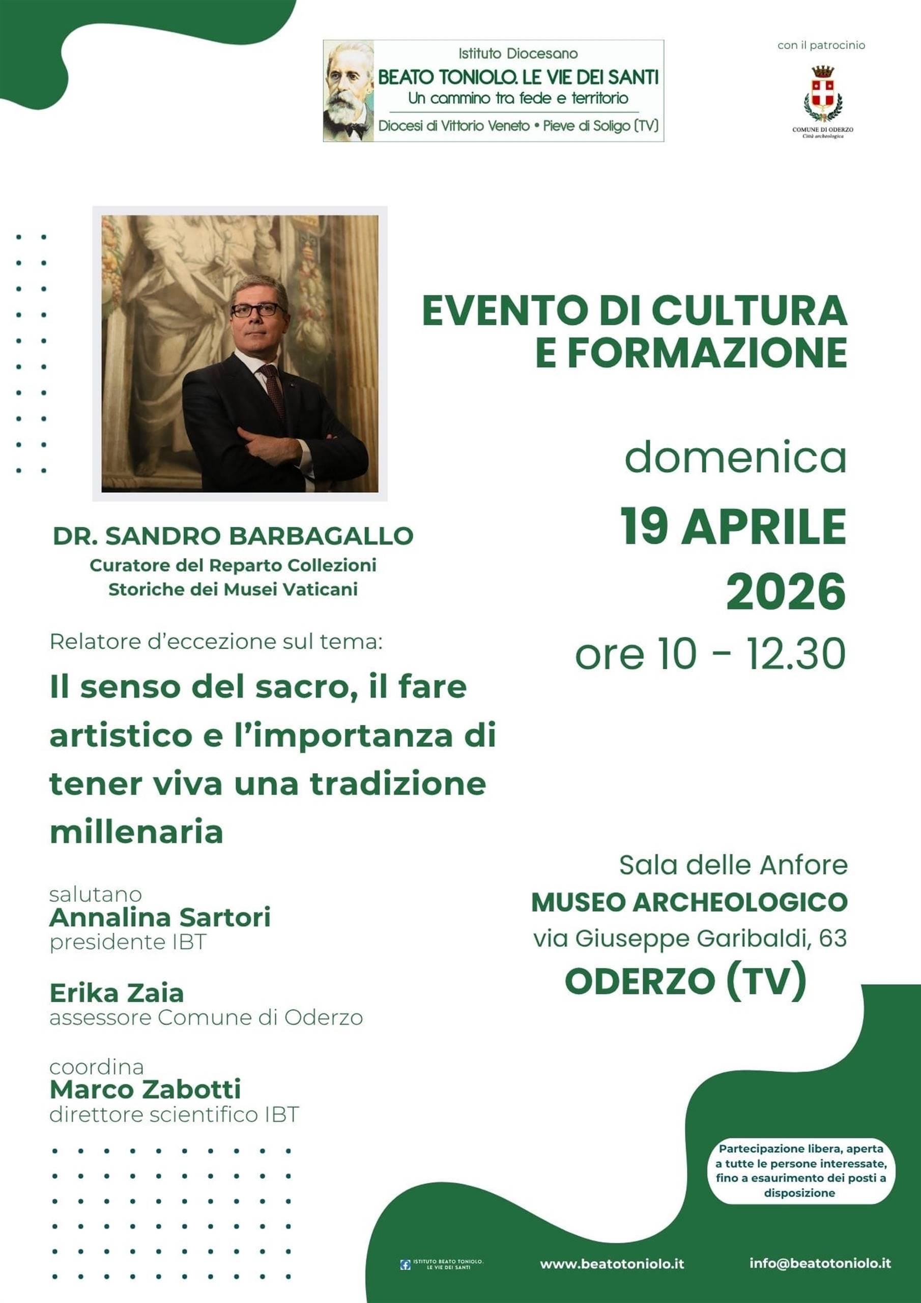 appuntamento dedicato alla cultura e alla formazione vi attende a Oderzo con la partecipazione del dott. Sandro Barbagallo, curatore del Reparto Collezioni Storiche dei Musei Vaticani, relatore d’eccezione su tematiche legate al senso del sacro, al fare artistico e all’importanza di mantenere viva una tradizione millenaria.