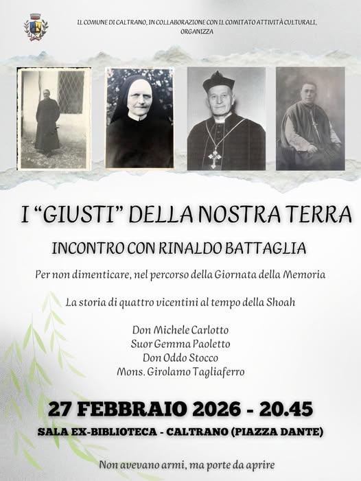 Venerdì 27 febbraio alle 20:45 in Sala Ex-biblioteca a Caltrano si terrà "I giusti della nostra terra", un incontro con Rinaldo Battaglia nel percorso della Giornata della Memoria.