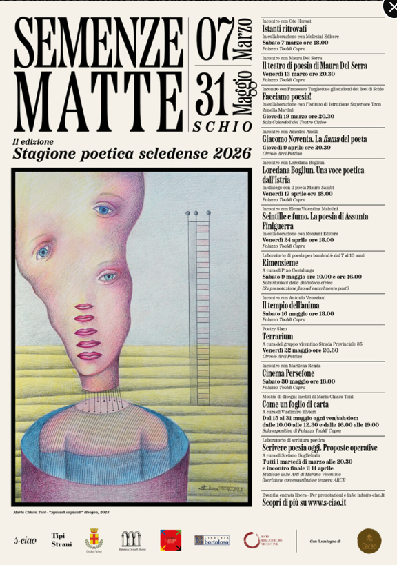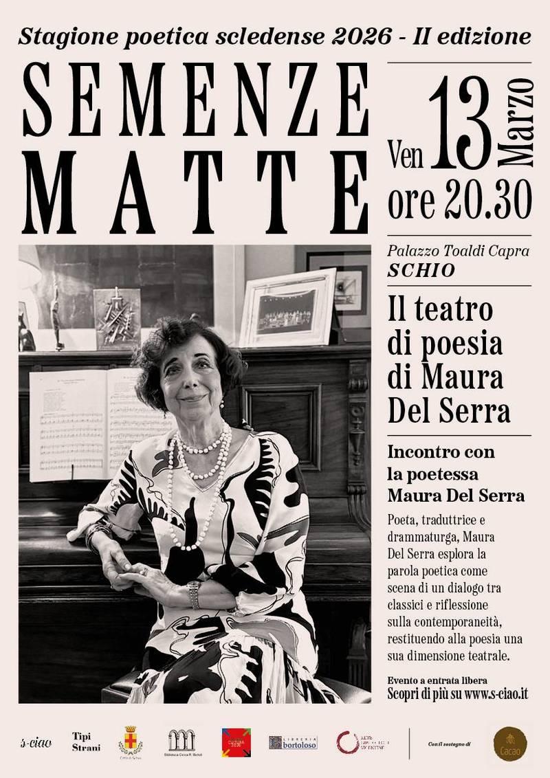 Dal 1 marzo al 31 maggio si terrà, nella città di Schio, la stagione poetica scledense 2025 Semenze Matte, a cura di Comune di Schio, Biblioteca civica e Libreria Bortoloso.