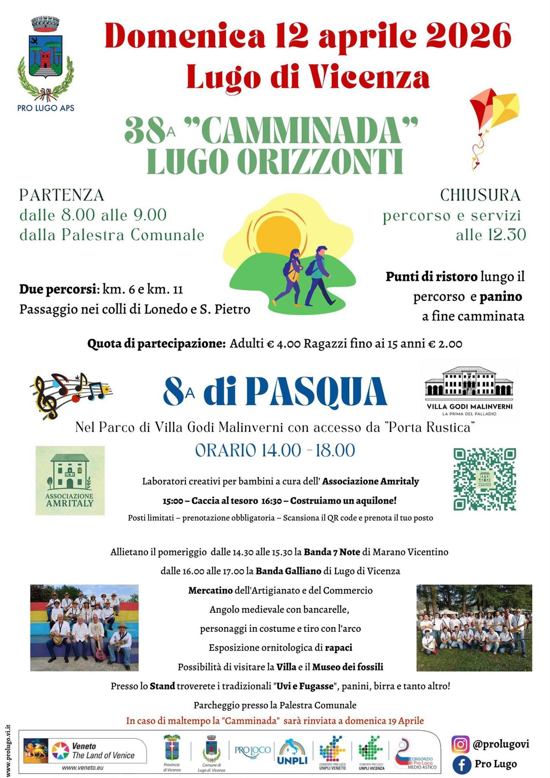 Domenica 12 Aprile 2026, si terranno, nei colli di Lonedo e S. Pietro e nel Parco di Villa Godi Malinverni, due eventi dal titolo "38° Camminada Lugo Orizzonti" e "8° di Pasqua", a cura della Pro Lugo APS.
