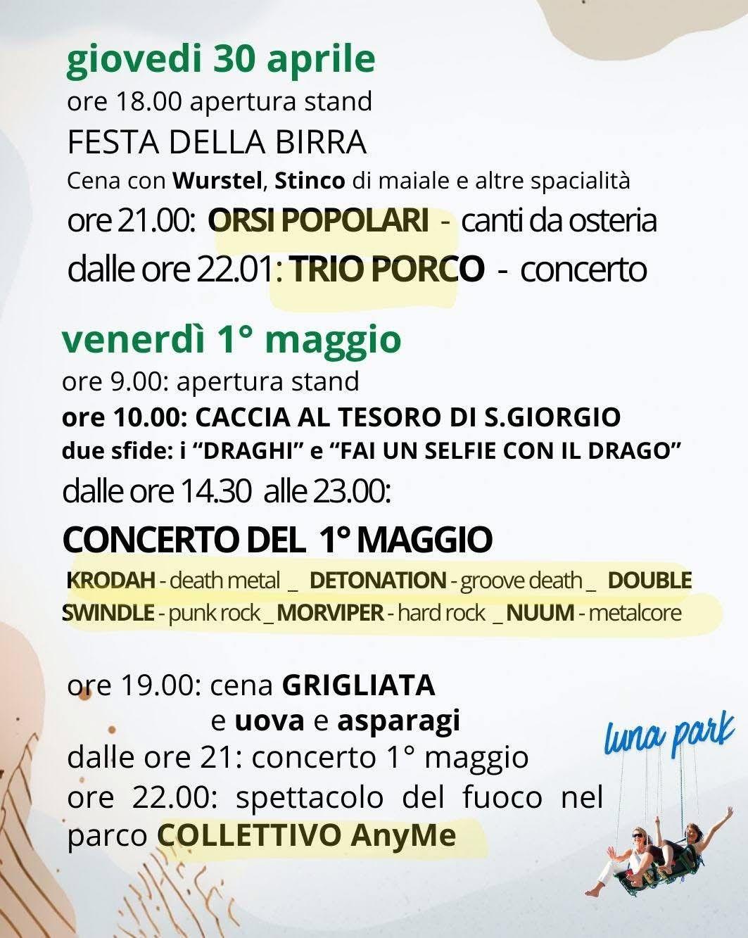 Venedì 1° maggio dalle ore 10.00 inizierà la caccia al tesoro di San Giorgio con due sfide: "draghi" e "fai un selfie con il drago". A seguire dalle ore 14.30 fino alle 23.00 concerto del 1° maggio.