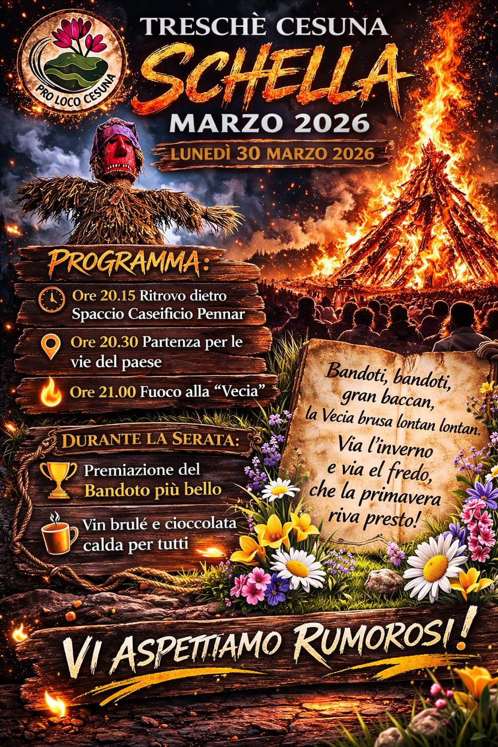 Alla fine si brucerà la veccia per scacciare via l'inverno e dare il benvenuto alla primavera!! Verranno offerti cioccolata e vin brulè ai partecipanti.