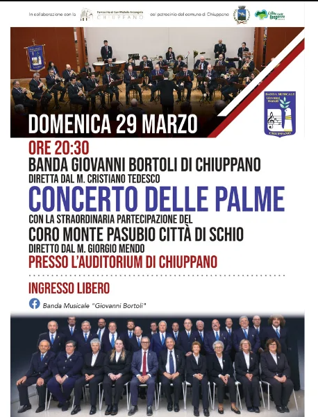 Domenica 29 marzo, alle ore 20:30, presso l'Auditorium di Chiuppano (VI), si terrà il Concerto delle Palme, organizzato dalla Banda "Giovanni Bortoli" di Chiuppano.