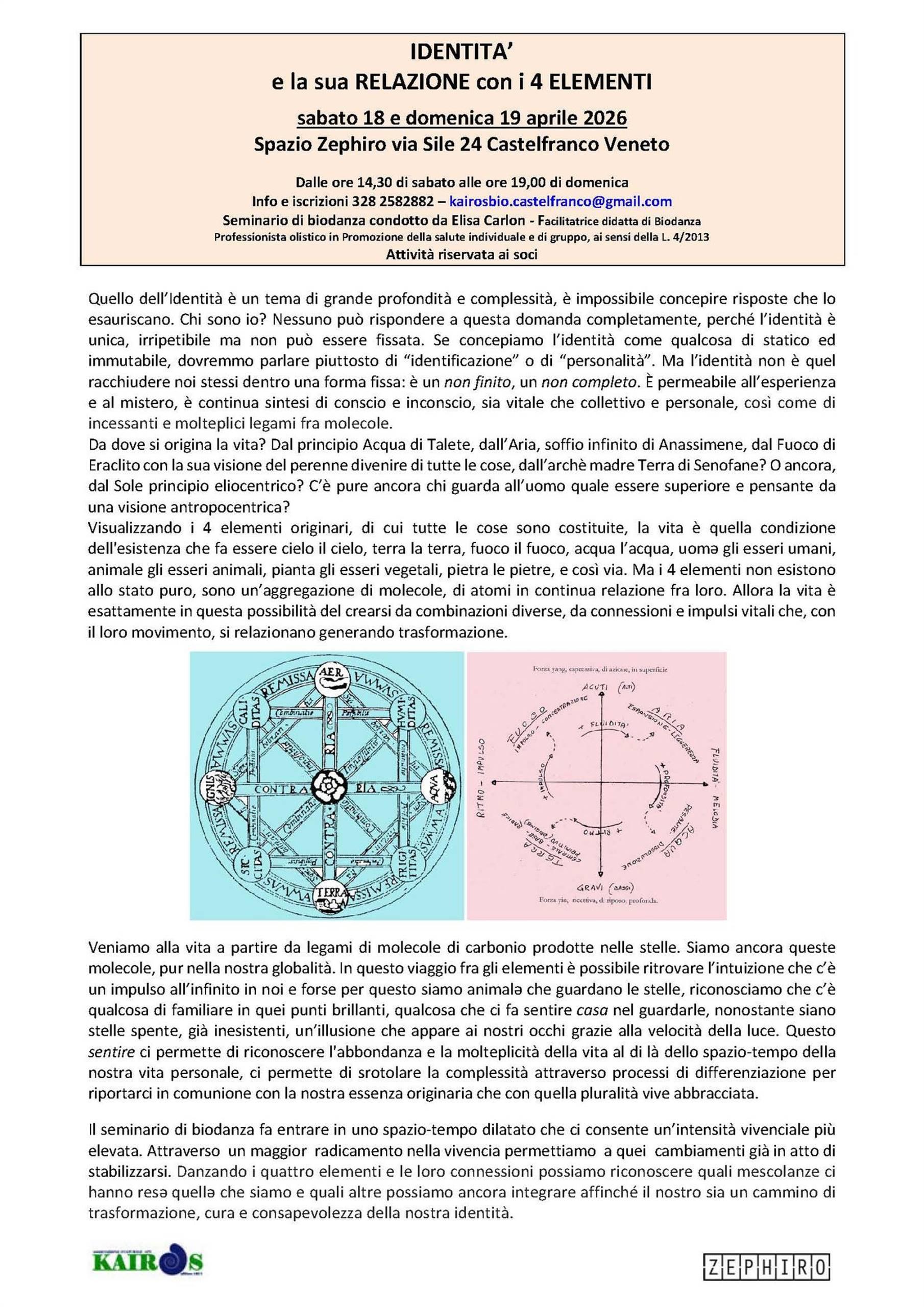 Nel fine settimana del 18 e 19 aprile 2026, lo Spazio Zephiro di Castelfranco Veneto ospiterà un seminario di Biodanza dedicato all'esplorazione dell'identità attraverso la relazione con gli elementi primordiali.