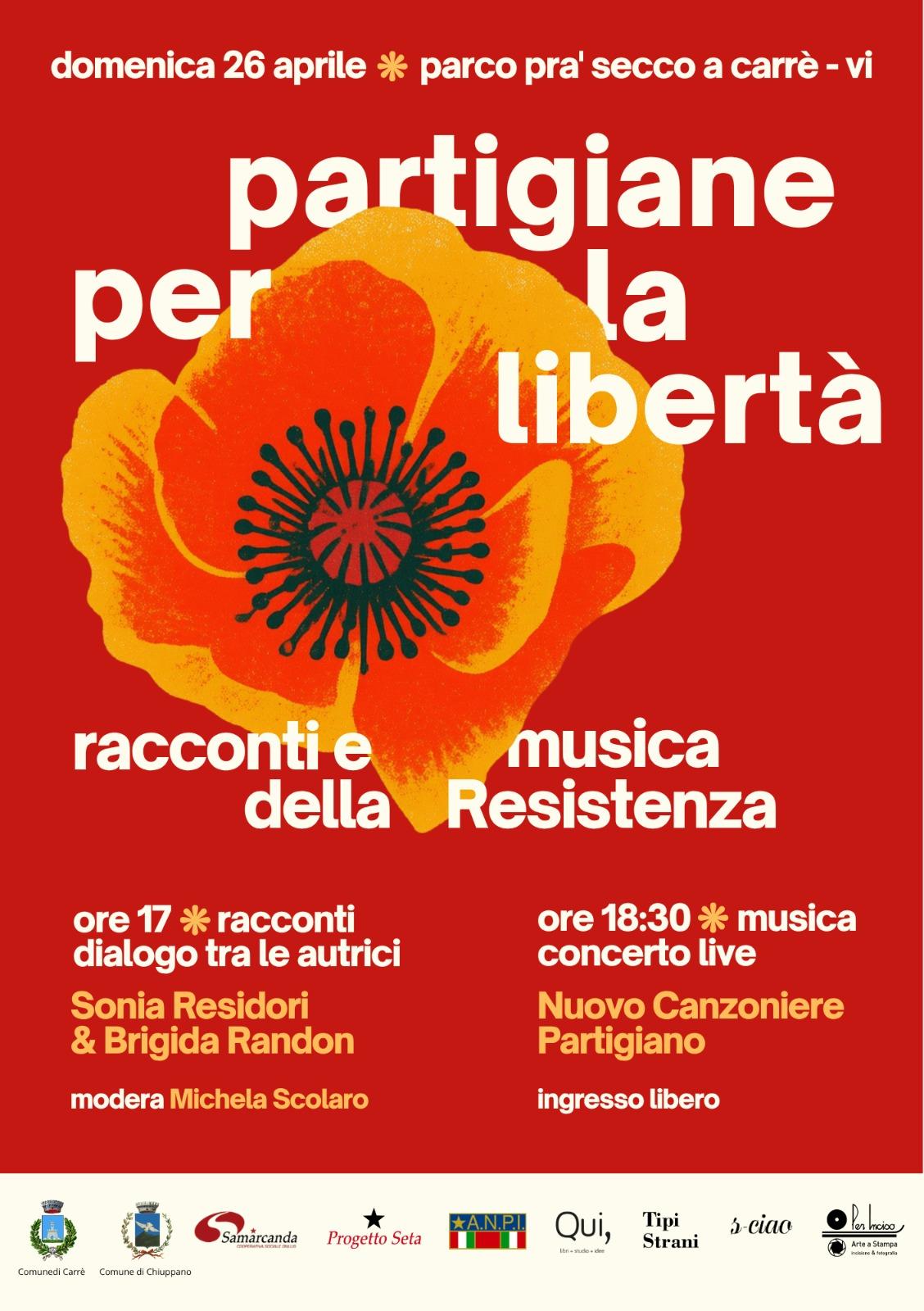 Domenica 26 aprile 2026 presso il Parco Prà Secco del Comune di Carrè, si terrà l'evento "Partigiane per la libertà" - Racconti e Musica della Resistenza.