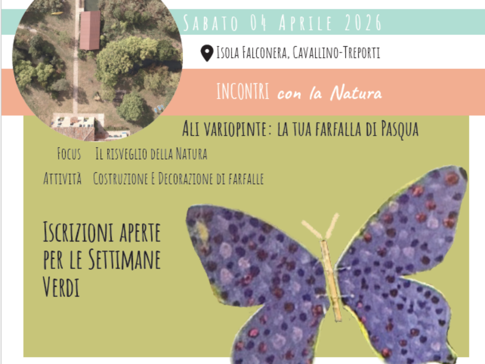 Sabato 4 aprile 2026 l’Isola Falconera, a Cavallino-Treporti, propone un pomeriggio dedicato alla primavera e alla Pasqua con l’iniziativa “Ali Variopinte: la tua farfalla di Pasqua”, rivolta a bambini e famiglie.