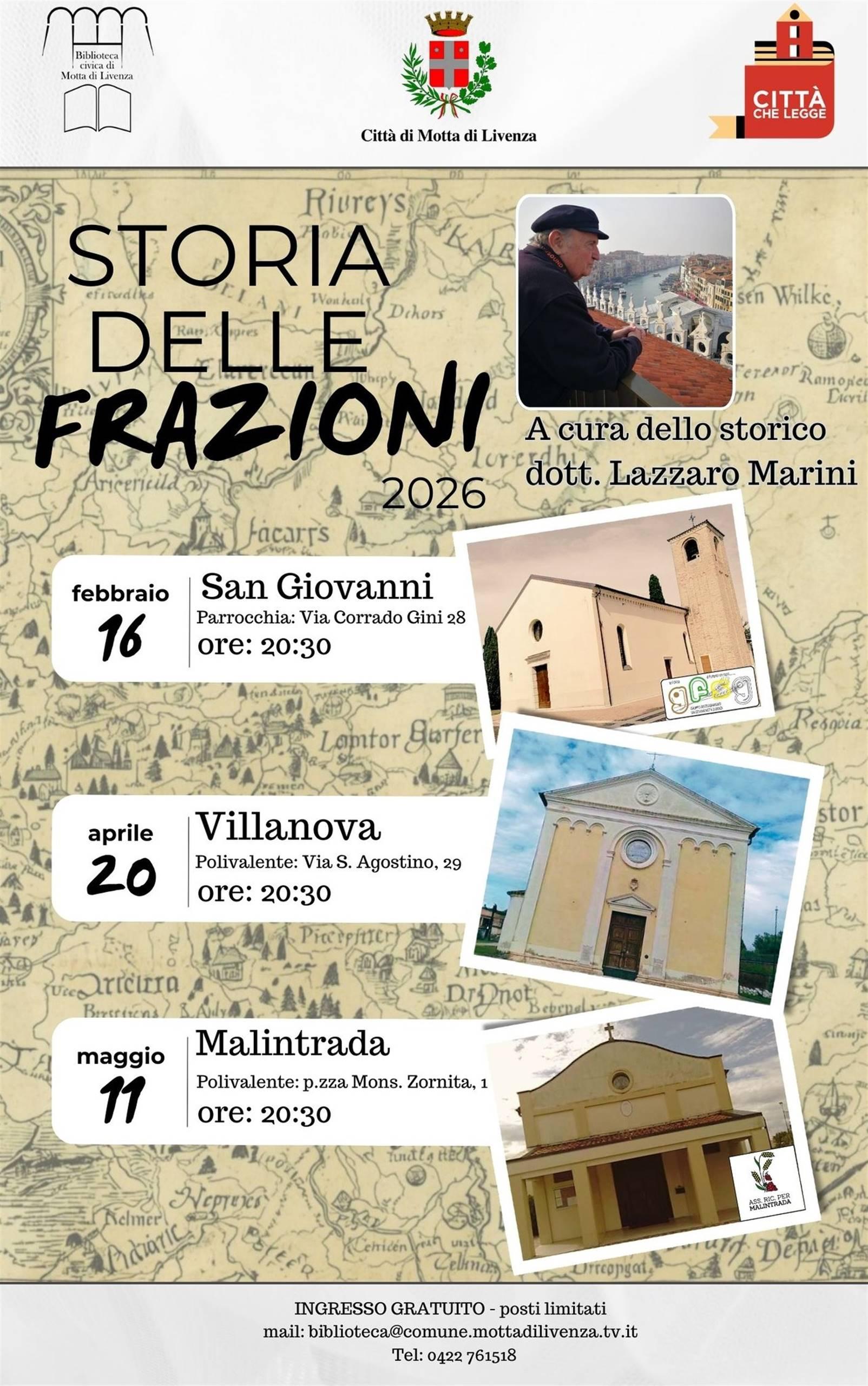 Un ciclo di incontri dedicato alla scoperta delle radici e delle tradizioni locali delle frazioni di Motta di Livenza: San Giovanni, Villanova e Malintrada. Guidati dallo storico dott. Lazzaro Marini, i partecipanti avranno l'opportunità di intraprendere un percorso tra vicende, testimonianze e curiosità.