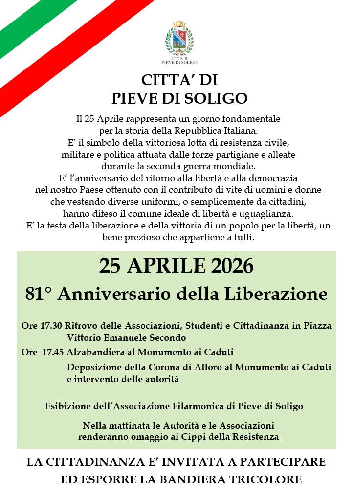 Il 25 Aprile, Pieve Soligo si prepara a celebrare uno dei momenti più significativi della storia nazionale: l’81° Anniversario della Liberazione. Una ricorrenza che richiama i valori fondanti della Repubblica Italiana e che ogni anno coinvolge istituzioni, associazioni e cittadini in un momento condiviso di memoria e riflessione.