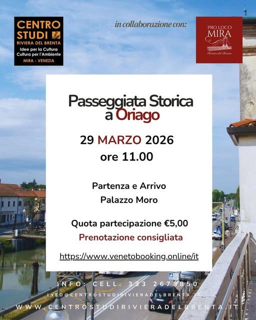 Domenica 29 marzo, appuntamento per una passeggiata nel centro storico di Oriago di Mira, vivace borgo fluviale della Riviera del Brenta, accompagnati dall'architetta ed esperta di storia del territorio Elisabetta Vulcano che illustrerà le principali trasformazioni del territorio, il suo patrimonio storico-culturale nonché curiosità e leggende!