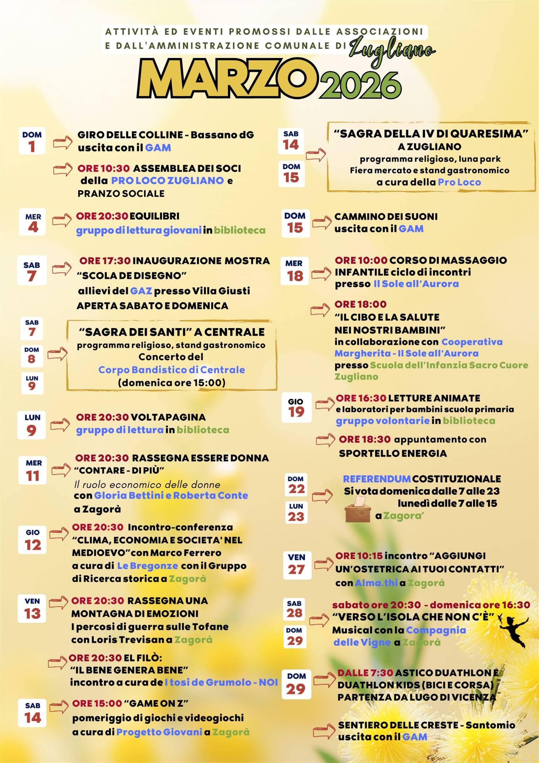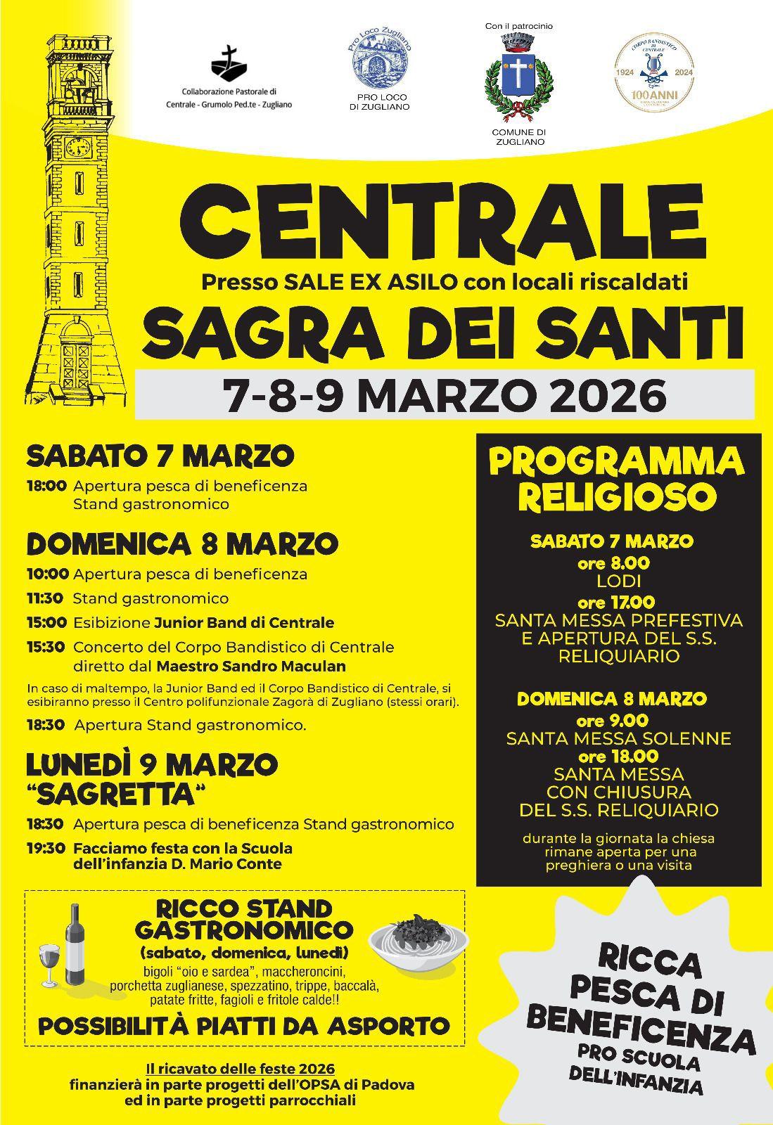Sabato 7 - Domenica 8 e Lunedì 9 Marzo 2026, si terrà, presso le sale dell'ex asilo di Zugliano, la Sagra dei Santi, evento organizzato dall'Unità Pastorale Centrale Grumolo Zugliano, Pro Loco di Zugliano, Gruppo bandistico di Centrale e con il patrocinio del Comune di Zugliano.