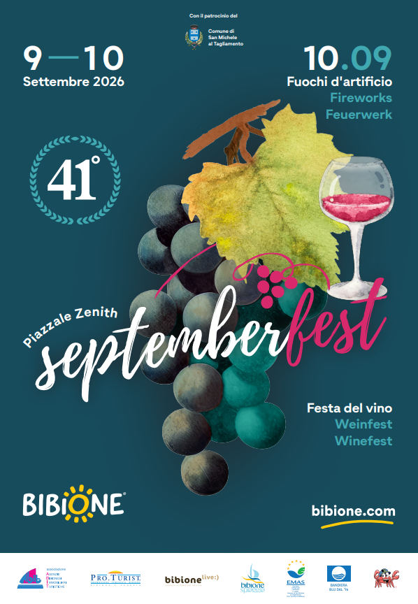 Settembre è il mese della vendemmia per antonomasia e Bibione lo celebra con la Septemberfest, la festa dell’uva e del vino, che il 09 e 10 settembre riempirà, come ogni anno, l’area festeggiamenti di Piazzale Zenith con stand enogastronomici, spettacoli musicali e pirotecnici.