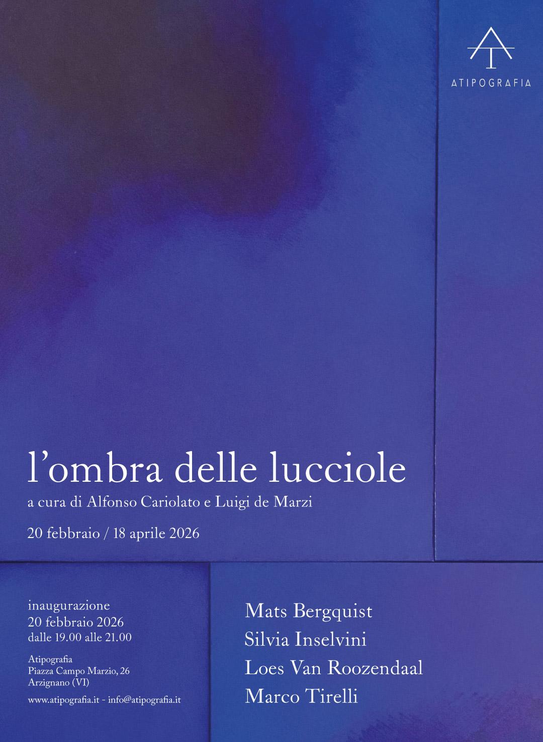 La nuova collettiva, a cura di Alfonso Cariolato e Luigi de Marzi, riunisce i lavori di Mats Bergquist, Marco Tirelli, Silvia Inselvini e Loes van Roozendaal, legati tra loro dal tema della luce, come presenza capace di rendere parzialmente percettibili infinite possibilità dell’essere e dell’esistere. La trilogia espositiva ha inaugurato nel 2025 con la mostra Matermània/Matermanìa, in cuisei artisti hanno approfondito ilsoggetto della maternità, inteso come primo momento di collettività in cui l’io diventa noi. Se l’uomo è inserito in un tutto, L’ombra delle lucciole prosegue il ragionamento suggerendo l’idea dell’impossibilità di comprendere a pieno il mondo che ci circonda, senza accettare il mistero del suo semplice fatto di essere.