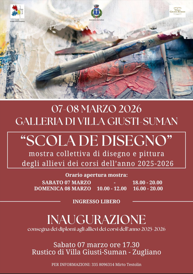 Sabato 7 marzo e Domenica 8 marzo si terrà presso la Galleria di Villa Giusti Suman a Zugliano "Scola de disegno", la mostra collettiva di disegno e pittura organizzata dal G.A.Z Gruppo Artisti Zugliano in collaborazione con il Comune di Zugliano.