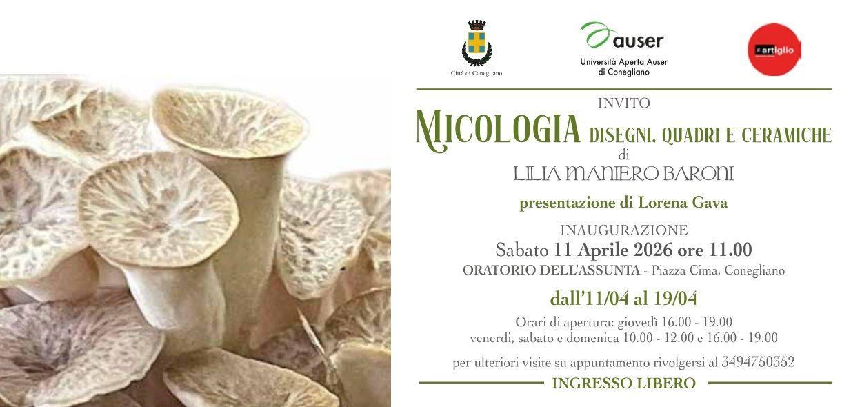 Dall'11 al 19 Aprile si terrà presso l'Oratorio dell'Assunta in Piazza Cima a Conegliano una mostra con disegni, quadri e ceramiche dedicate alla micologia, a cura dell'artista Lilia Maniero Baroni.