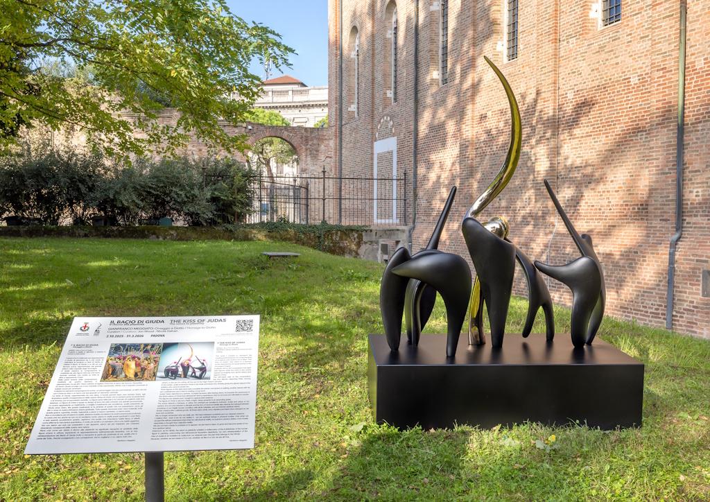 Fulcro della mostra è la scultura Il Bacio di Giuda, ispirata all’omonima scena affrescata da Giotto nella Cappella degli Scrovegni, uno dei capolavori assoluti dell’arte medievale. L’opera, collocata proprio di fronte al suo ingresso, è composta da otto figure nere e da una figura centrale lucente, che rappresenta Cristo e svetta su tutte le altre in una spirale ascensionale, ispirandosi alla medesima tensione che si riscontra nel capolavoro trecentesco. Accanto a quest’opera, che costituisce il cuore pulsante del progetto, Padova accoglie altre tredici sculture disseminate tra luoghi simbolici e spazi periferici. Dal Castello Carrarese al Listòn, da piazza Eremitani ai Giardini dell’Arena Romana fino a piazza Castello e a piazza Azzurri d’Italia, la città si trasforma in un museo a cielo aperto, in cui l’arte si intreccia con la memoria storica e con la vita quotidiana.