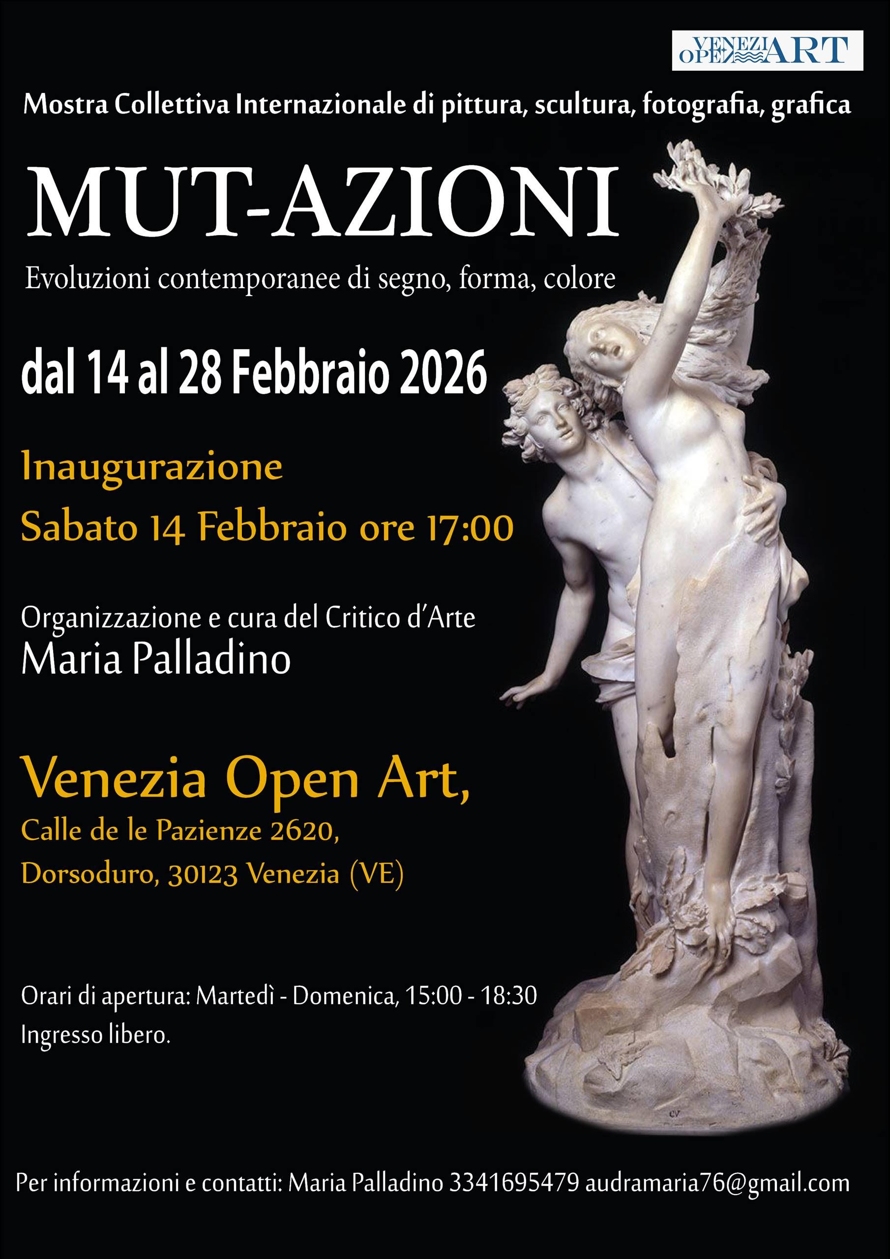 Dalle “Metamorfosi” di Ovidio, poema epico composto tra il 2 e l'8 d.C. e le opere costituenti la personale “Maxima Proposito (Ovidio)” di Joseph Kosuth nel 2018, intercorrono due millenni, spostamenti di prospettiva, di significati e mezzi espressivi. Dal concreto all'astratto, dalla messa alla berlina di vizi e peccati di dei, semidei ed uomini tramite punizioni esemplari e modelli edificanti, all'indagine relativa alla differenza di senso rispetto alla diversità di punti di vista per ciascun individuo, il salto è sostanziale, e rispecchia il passare del tempo, l'evolversi della mentalità e delle dinamiche sociali. Il concetto di mutamento, trasformazione, è alla base dell'esistenza di tutti gli esseri viventi e tutte le cose del mondo, il fondamento dell'esistenza stessa, dettato da quel principio secondo il quale nulla si crea e nulla si distrugge. Premessa e fine di ogni agire umano, come dell'agire artistico, è un processo di crescita e pertanto di mutazione che conduce gli antecedenti ad un prodotto diverso e nuovo, una creatura o un'opera, rivivificate e cambiate di segno. Innumerevoli gli artisti che nel corso della storia hanno tratto ispirazione dal poema ovidiano: Apollo e Dafne (1623 – 1625) di Gian Lorenzo Bernini, Danae (1545 – 1554) di Tiziano Vecellio, Leda e il cigno (1550 – 1560) di Jacopo Tintoretto, la Punizione di Marsia (1570 – 1576) di Tiziano, Narciso (1597 -1599) di Caravaggio, Amore e Psiche (1787 -1793) di Antonio Canova, per citarne solo alcuni. Successivamente altrettanti numerosi autori hanno espresso nello stile e nel linguaggio a loro proprio la transizione da una sembianza all'altra: negli accostamenti di soggetti fra loro contraddittori, nella fusione straniante di elementi marcata dal dinamismo del processo, nell'implicazione di misteriosi significati simbolici: Hyeronimus Bosch ( - 1516) e i suoi incubi controriformisti, Giuseppe Arcimboldo (1526 – 1593) con le fantasiose pareidolie antropomorfe di fiori e frutta, Giorgio De Chirico (1888 – 1978) e la traduzione della realtà in enigmi e rebus, Maurits Cornelits Escher (1898 -1972) tramite i suoi arditi scorci geometrici, Salvador Dalì (1904 – 1989) e le distorsioni generate dall'inconscio. La capacità di trovare strade innovative, mezzi di espressione non consueti, interpretazioni non scontate, di mettere in discussione il precedente e abbracciare il coraggio del rinnovamento risulta essere nell'epoca attuale una facoltà di preponderante importanza e necessità, nel quotidiano come nell'arte: gli artisti in mostra esplorano questi concetti, portando alla luce creazioni originali, opere uniche che riflettono la sensibilità contemporanea e la spinta verso ulteriori forme espressive, senza perdere di vista la preziosa eredità culturale del passato. 06.02.2026 Maria Palladino In esposizione opere degli artisti: Daniela Fogar, Davide Kapanadze, Francesca Schiavon, Gianluca Grosso, Giuliano Convento, Hide (Elizaveta Beskrovna), Iolanta Tataru, Laura Bonomo, Leo Napoletano, Luca Berno, Maiya Petra, Manuel Silvestrin, Marcella Carbonaro, Maria Letizia Costa, Marta Casarin, Paolo da San Lorenzo, Salvatore Salamone, Sandra Boschetti, SenHava (Eseniya Gavrilova), Serena Contino, Stefania Guerrieri, Susanna Gatto.