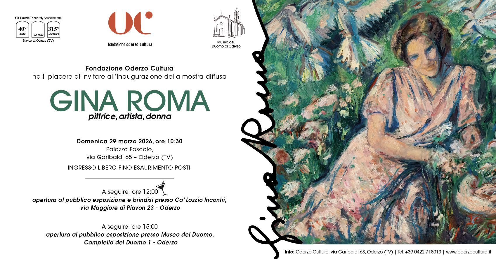 Dal 29 marzo al 28 giugno 2026 Oderzo ospita la mostra dedicata a Gina Roma, artista profondamente legata al territorio opitergino e protagonista della scena culturale del Novecento.