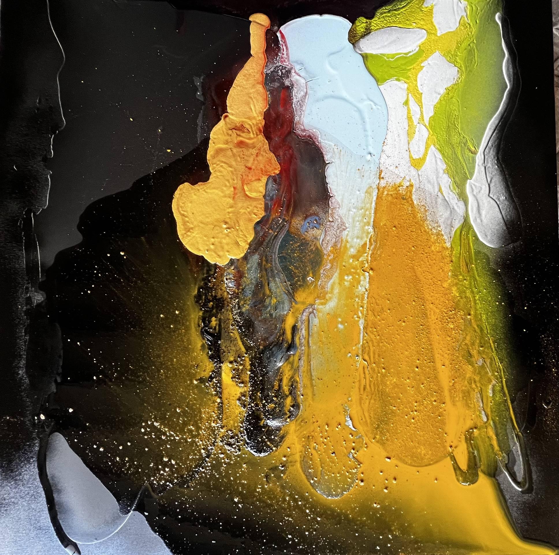 La sua riflessione è mediata dall’istintività del gesto manipolativo, dal pouring che goccia a goccia imprime alla sostanza l’energia di un serrato dialogo tra colori freddi e caldi. Essi si respingono per il contrasto tra l’intensità dei chiari, cristalli riflettenti di luce, e la profondità degli scuri, costellazioni del mistero profondo, ma, al contempo, si lambiscono, scivolando con le loro propaggini l’uno nell’altro, in una continua e affannosa ricerca di equilibrio.