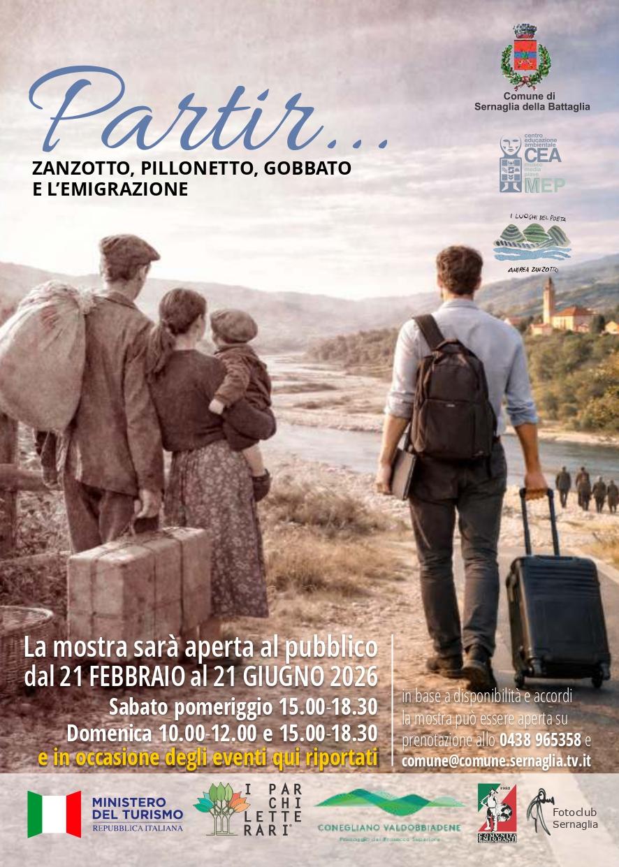 La mostra "Partir...Zanzotto, Pillonetto, Gobbato e l'emigrazione", ideata ed organizzata dal Comune di Sernaglia in collaborazione con l’Associazione I Luoghi di Zanzotto, ricorda una delle esperienze più significative che hanno attraversato la storia del Veneto, trasformandolo profondamente dalla fine dell’Ottocento alla seconda metà del Novecento: l'emigrazione di migliaia di uomini e donne che, spinti dalla povertà e dalla mancanza di lavoro, lasciarono le campagne e i paesi in cui avevano affondato le proprie radici, per raggiungere Brasile, Argentina, Stati Uniti, ma anche l’Europa del Nord e le colonie africane, dove costruirono comunità solide e durature lontano da casa.