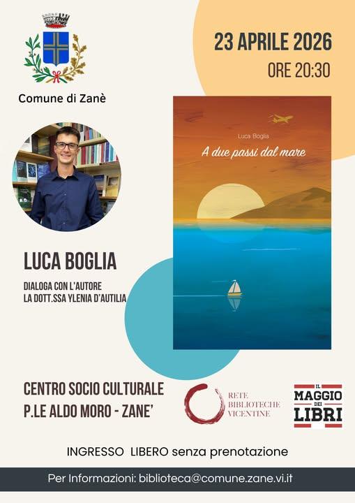 Giovedì 23 aprile 2026 alle ore 20:30 si terrà presso il Centro Socio Culturale P.LE Aldo Moro del Comune di Zanè, un incontro con Luca Boglia, autore del libro "A due passi dal mare".