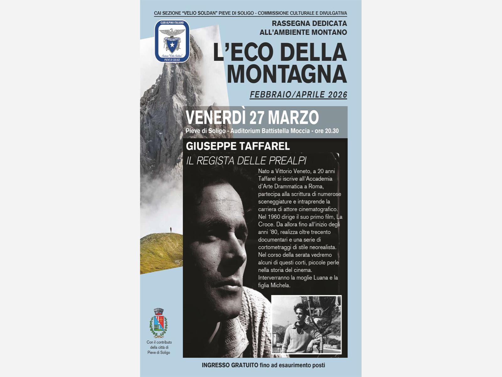 Con il nuovo evento della rassegna "L'eco della montagna", il Club Alpino Italiano (Sezion Velio Soldan) di Pieve di Soligo propone una serata dedicata all'ambiente montano visto attraverso gli occhi - e la cinepresa - del regista delle Prealpi, Giuseppe Taffarel.