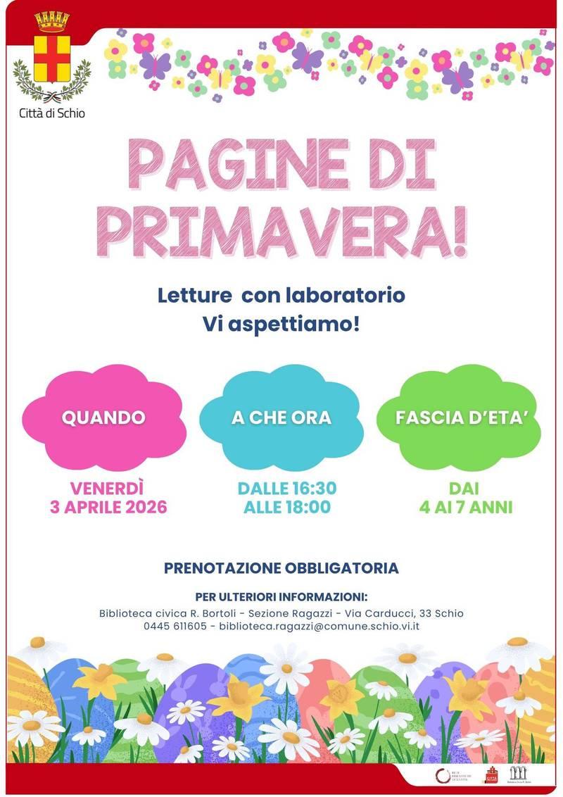 Venerdì 3 aprile 2026 alle 16:30 presso la Biblioteca Civica di Schio si terrà "Pagine di primavera"