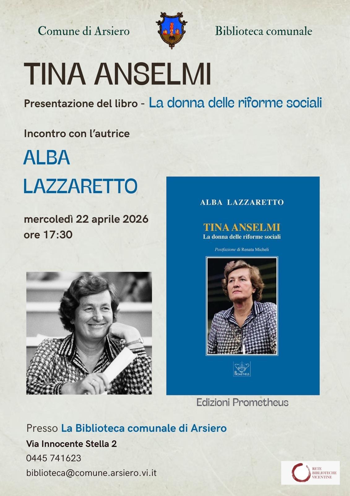 Mercoledì 22 aprile 2026 alle ore 17:30 presso la Biblioteca Comunale di Arsiero, ci sarà la presentazione del libro "Tina Anselmi, La donna delle riforme sociali", con l'autrice Alba Lazzaretto.
