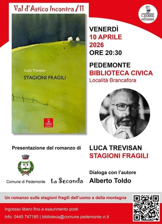 Venerdì 10 aprile 2026 alle ore 20:30 si terrà la presentazione del romanzo di Luca Trevisan intitolato "Stagioni Fragili" che tratterà argomenti sulle stagioni fragili dell'uomo e della montagna.