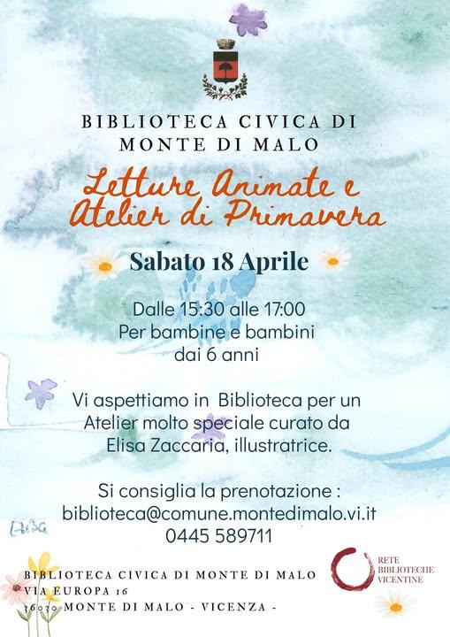 Sabato 18 aprile 2026 dalle ore 15:30 alle 17:00 potrete assistere a "Letture Animate e Atelier di Primavera" curato da Elisa Zaccaria (illustratrice) presso la Biblioteca Civica di Monte di Malo.